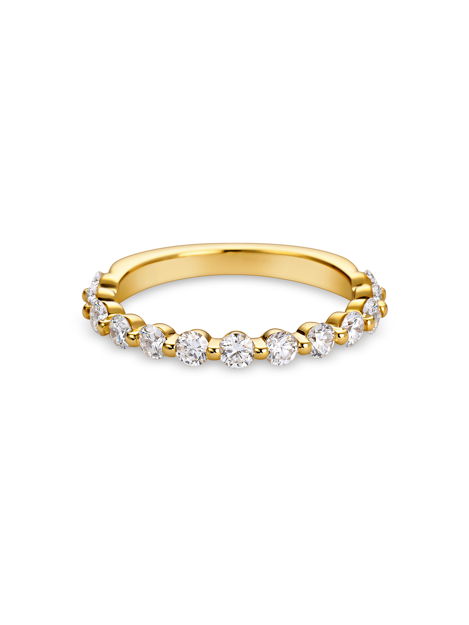This refined half eternity ring features a series of round lab grown diamonds in a classic shared claw setting, creating a seamless row of light and sparkle. The shared claw design allows more light to pass through the stones while maintaining a clean, minimal profile.