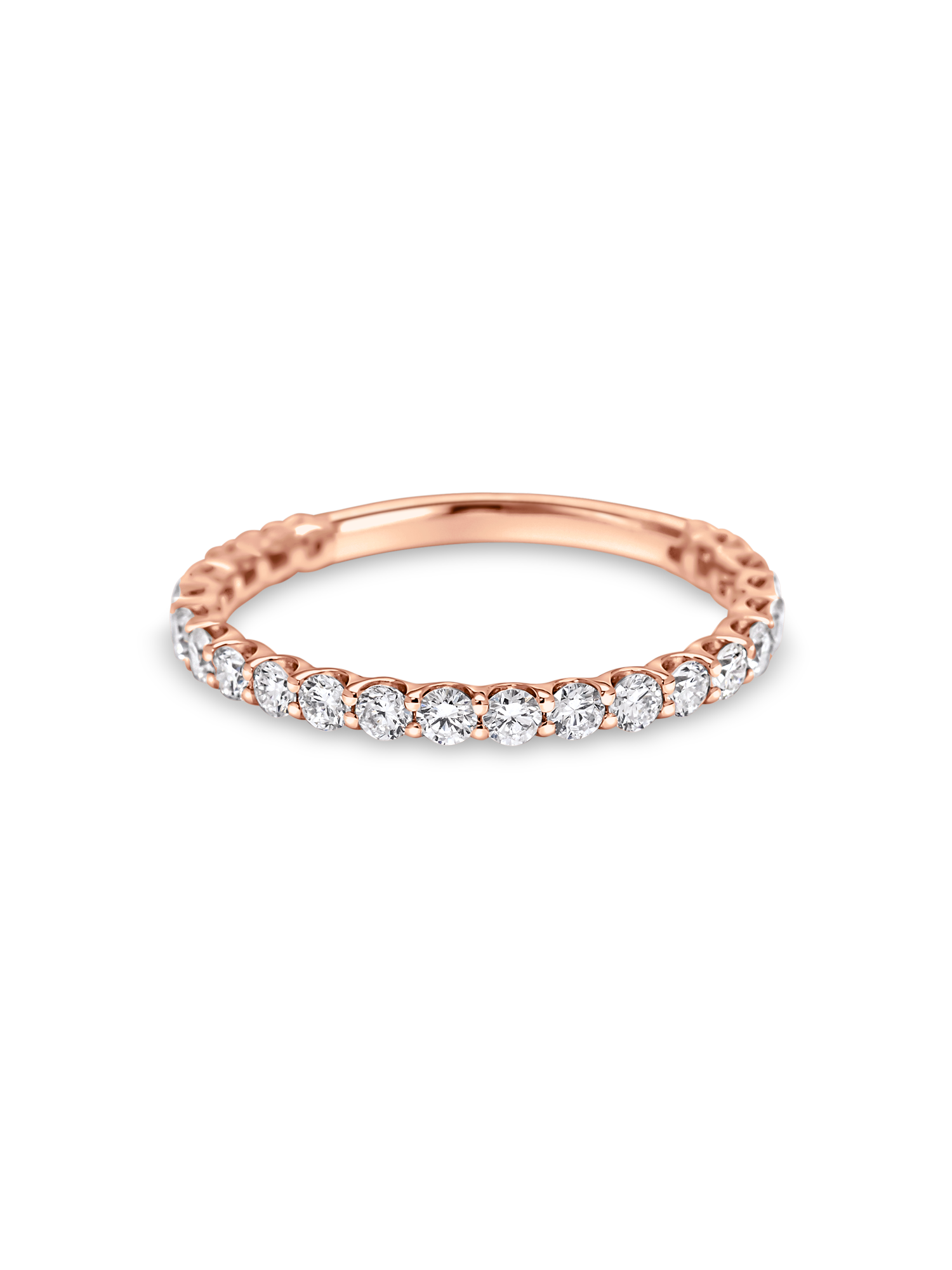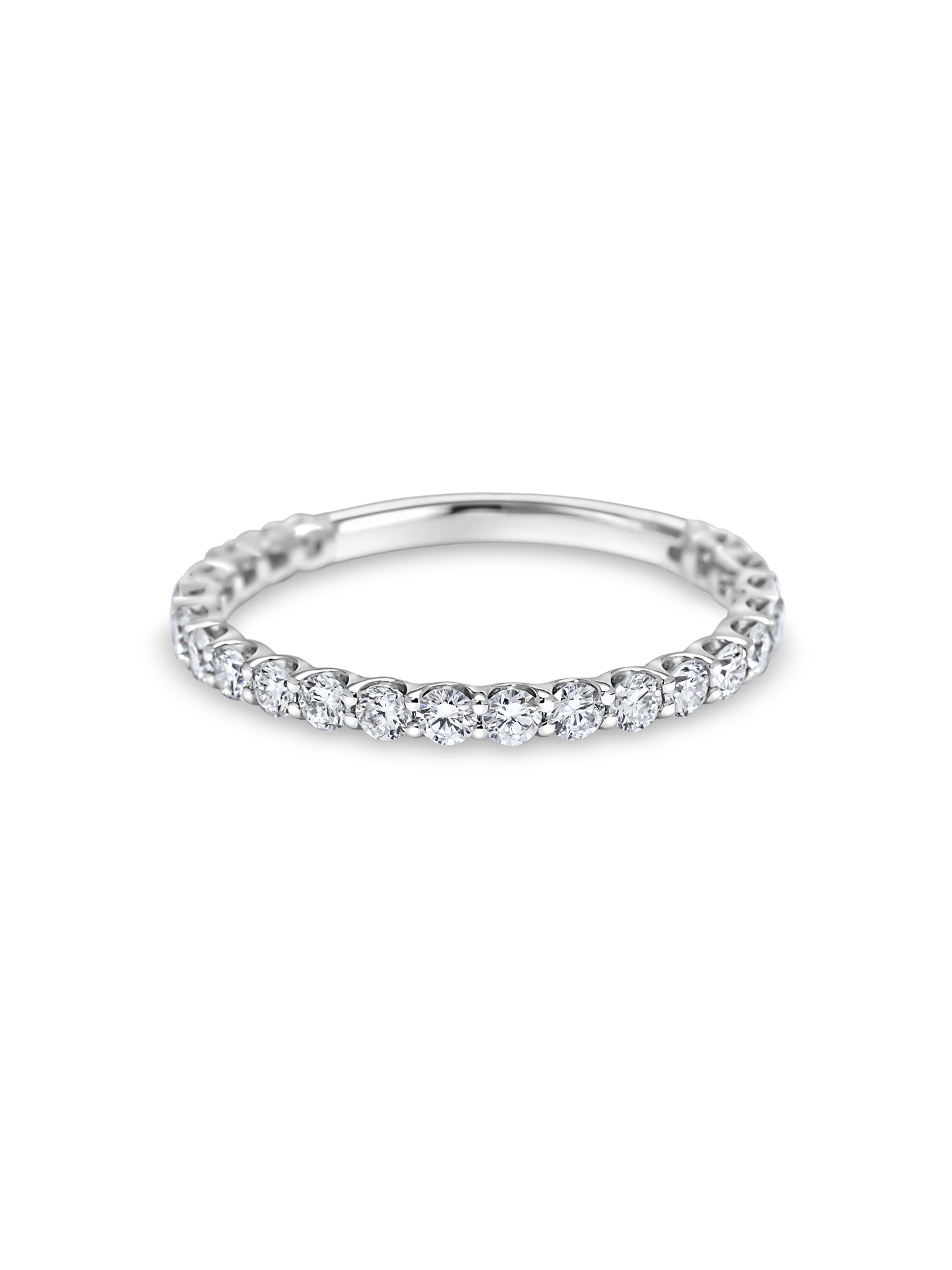 This three-quarters set eternity ring features a graceful arc of round lab grown diamonds, prong-set to maximise light while offering everyday practicality. The 3/4 set design provides the brilliance of a full band with added comfort and wearability.